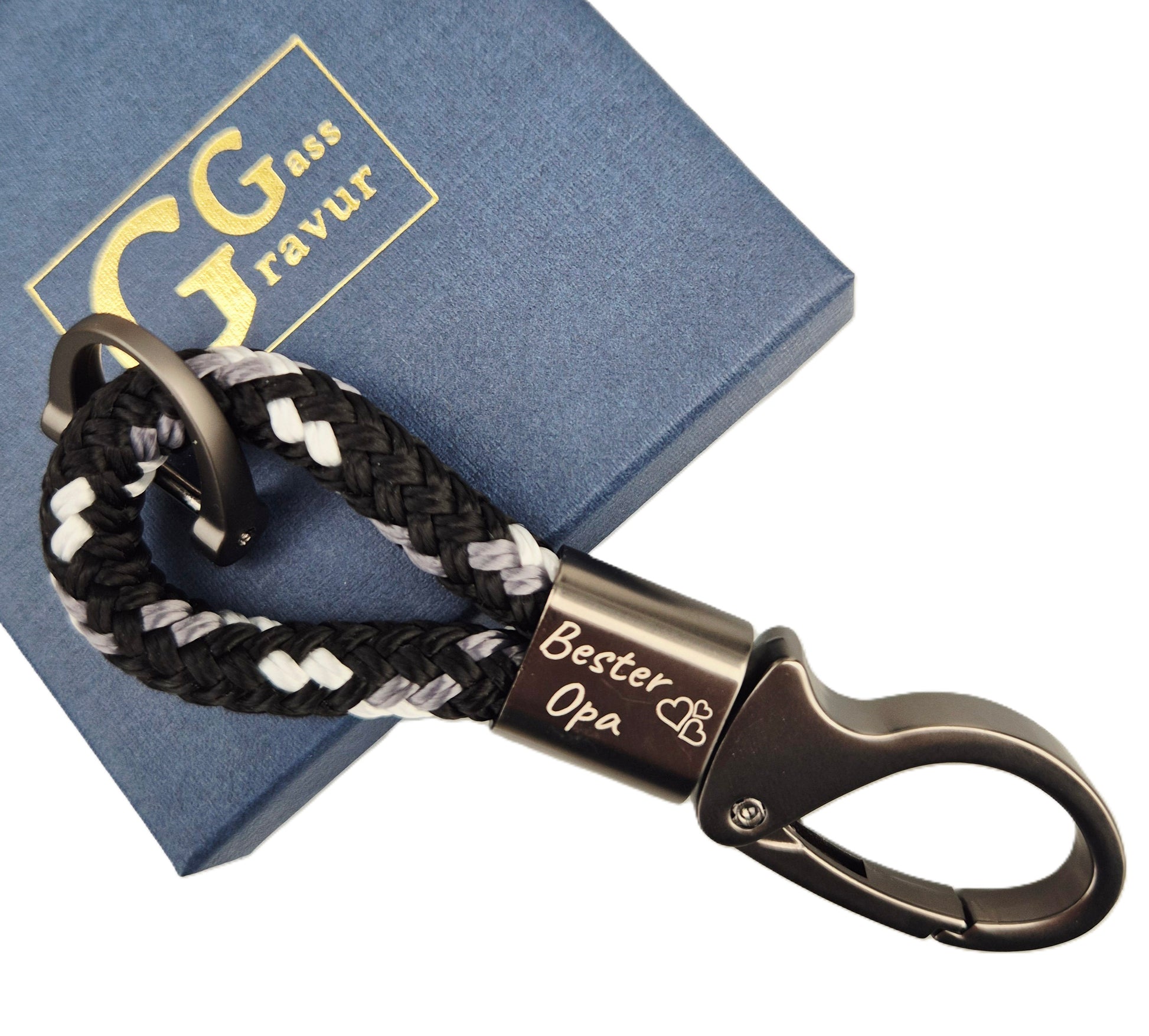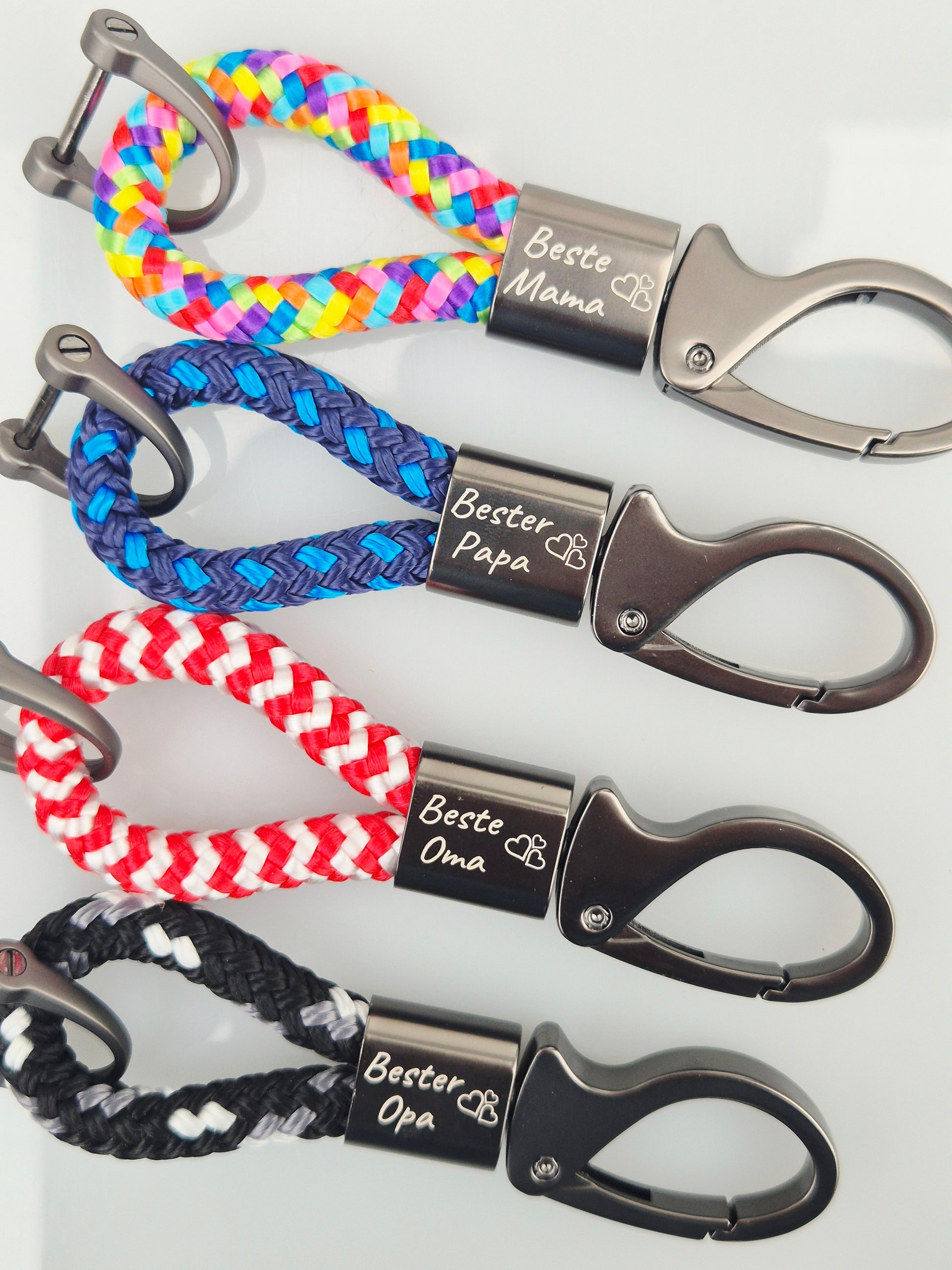 Schlüsselanhänger aus Segeltau (8mm) mit Karabiner, Schäkel und individueller Wunschgravur